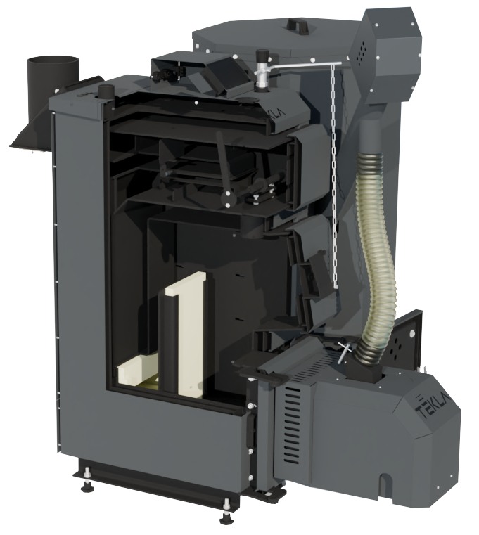 Výmenník tepla je vyrobený z vysoko kvalitnej ocele s hrúbkou 6 mm, ktorá zaručuje dlhú životnosť, mechanickú odolnosť a spoľahlivú prevádzku aj pri dlhodobom zaťažení. Optimalizované usporiadanie spaľovacej komory a výmenníka umožňuje dosahovať vysokú účinnosť a efektívny prenos tepla do vykurovacieho systému.